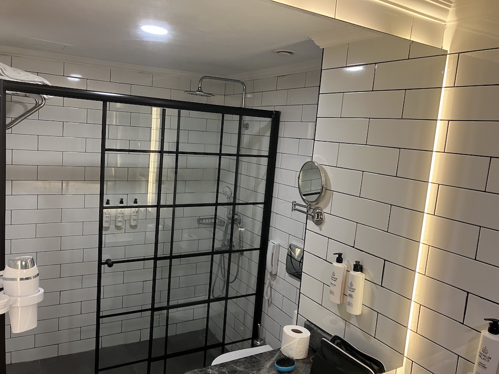 - Badkamer met douche, toilet, telefoon (voor nood?)